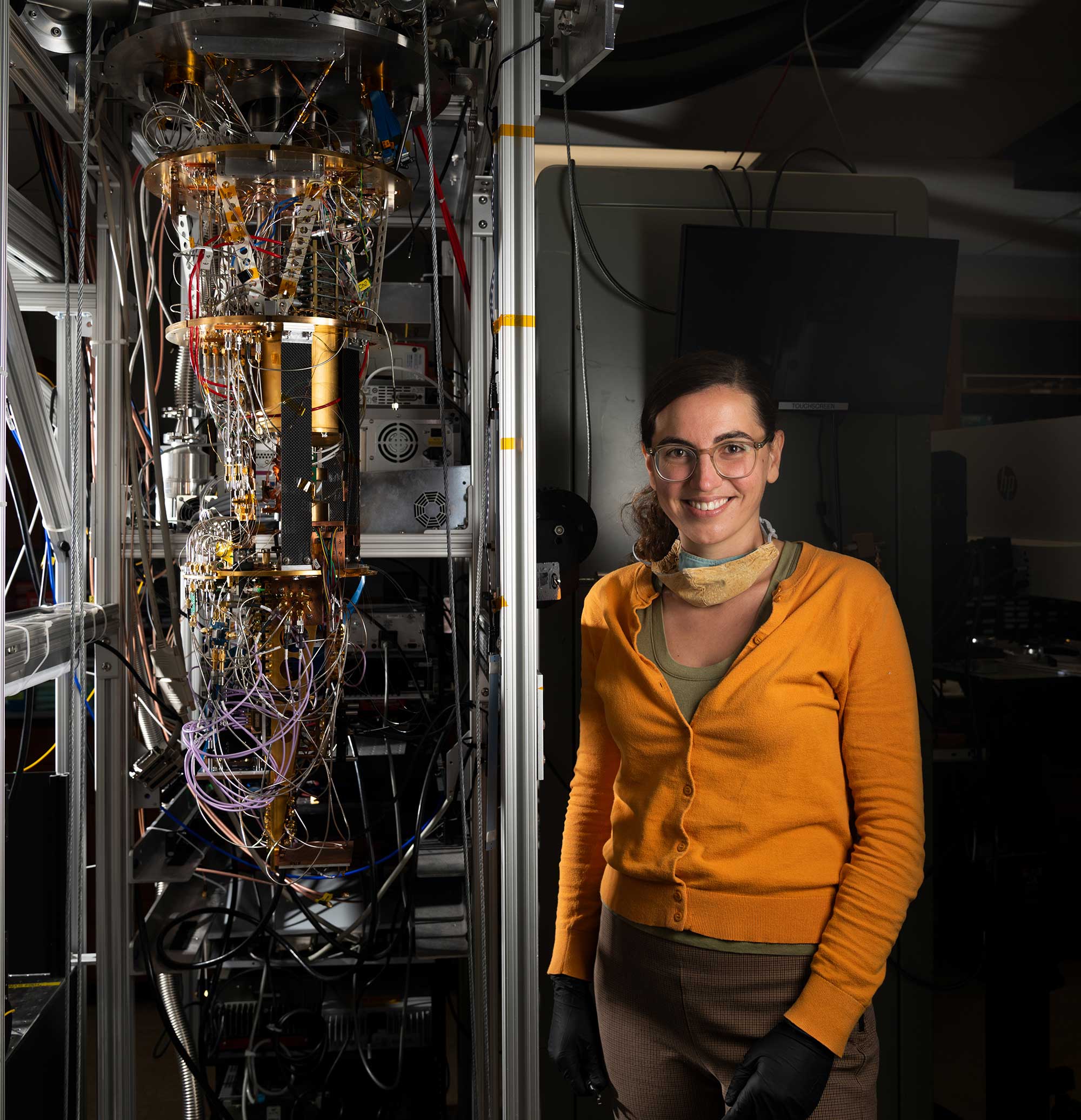 Ioana Craiciu, die Leiterin der Studie, steht neben dem Kryostat, mit dem PEACOQ (Performance-Enhanced Array for Counting Optical Quanta) bei Temperaturen von nur einem Grad über dem absoluten Nullpunkt getestet wurde. Bei dieser Temperatur befindet sich der Detektor in einem supraleitenden Zustand, der es seinen Nanodrähten ermöglicht, absorbierte Photonen in elektrische Impulse umzuwandeln.